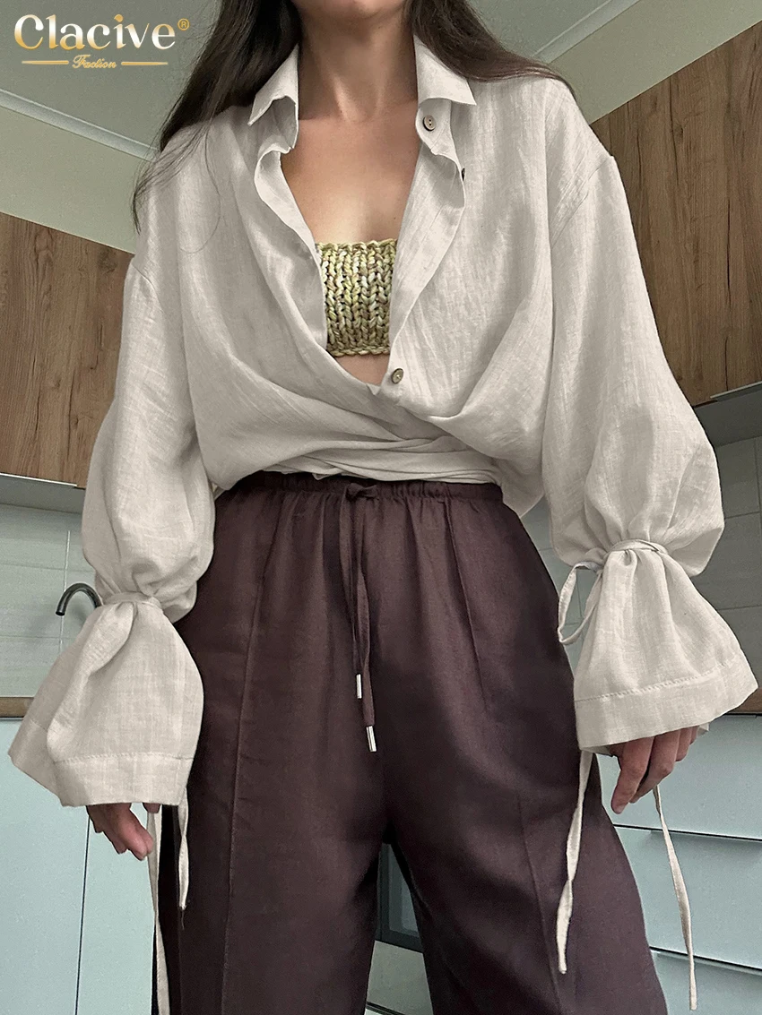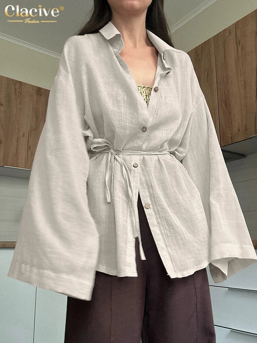 Clacive Fashion Loose Khaki Women's Blouse 2025 Elegant Lapel Long Sleeve Shirt Elegant Classic Solid Top Female Clothing