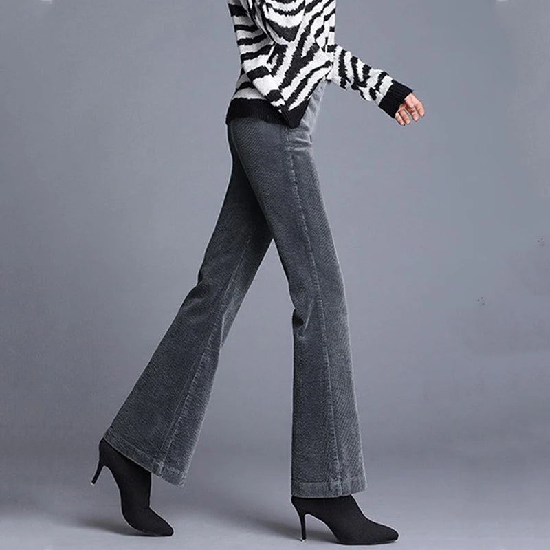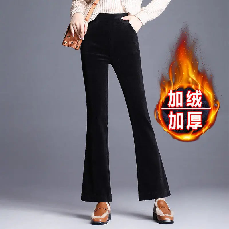 Simplicity Fashion Autumn Winter Corduroy Flare Pants Women Solid Pocket Elastic High Waist Plus Velvet Straight Casual Trousers